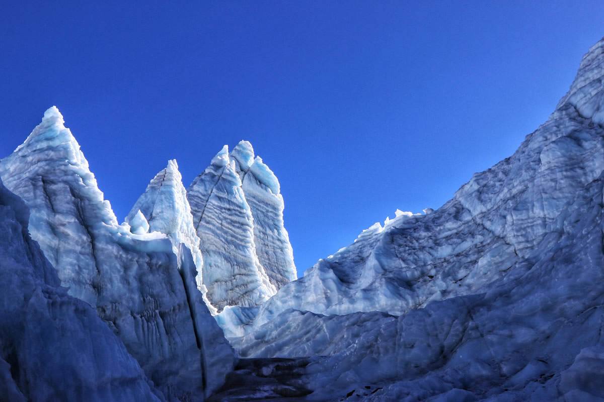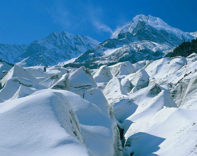 由于积雪在阳光的照射下融化,因受周围低温影响,马上又凝结成冰;有些则在重压的作用下,压紧凝结,形成冰。这些冰随着体积和重量的不断增加,最终成为冰川冰。冰川冰继续发展,当重力大于地面摩擦力时便会发生流动。有时,冰川在自身重力的作用下,也会发生塑性流动。