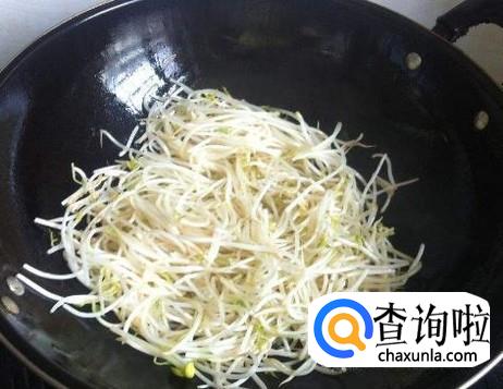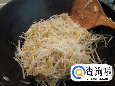 将绿豆芽放入锅中,用铲子翻炒均匀。