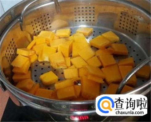 南瓜清洗干净之后把瓜瓤掏出来,切成块然后清洗一遍,放进蒸锅里蒸熟。