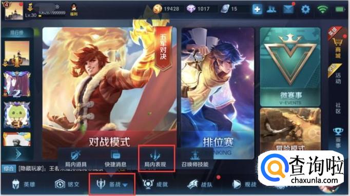 达到要求领取之后我们要来到,局内表现进行装备,在游戏大厅点击备战-局内表现。如图