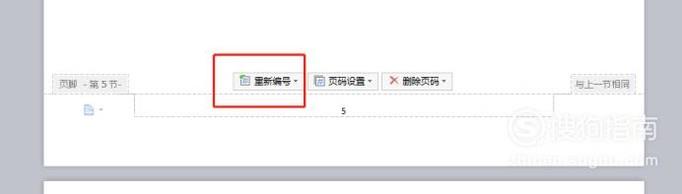 如果我们想把第五页文档,设置成开始第一页,这时候要找到第5页文档的页码“5”处,就会出现“重新编号”“页码设置”“删除页码”三个选项