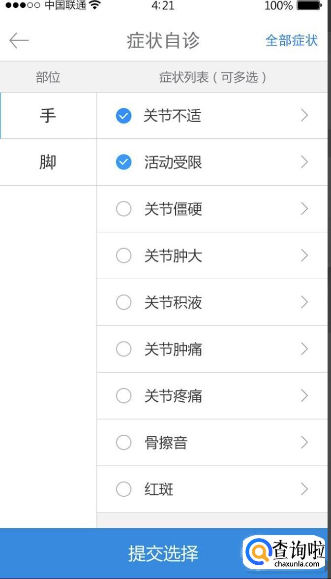 然后我们选择自己的症状,最后点击下方的“提交”,APP就会帮我们诊断问题了。