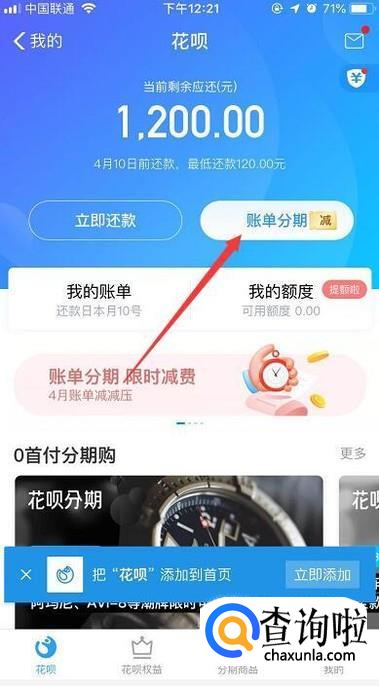 支付宝花呗分期还款,需要点击支付宝下方我的按钮,找到花呗,进入花呗页面后,点击账单分期,选择分期时间和金额,即可完成分期还款。