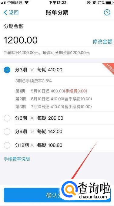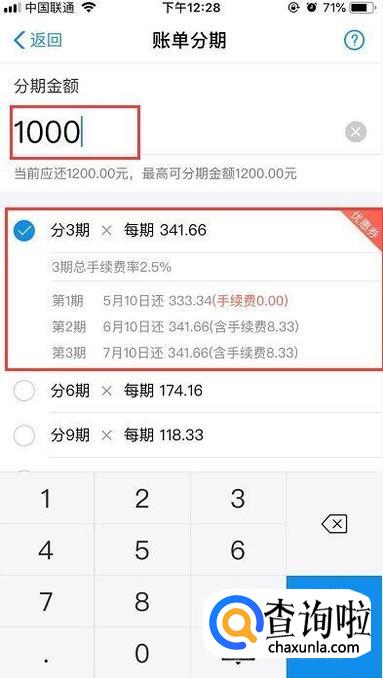 在账单分期页面,分期金额是可以选择的,点击“修改金额”,选择分期的时间,“分3期”、“分6期”、“分9期”,选择“分3期”是最优惠的,选择完毕后,点击“确定”