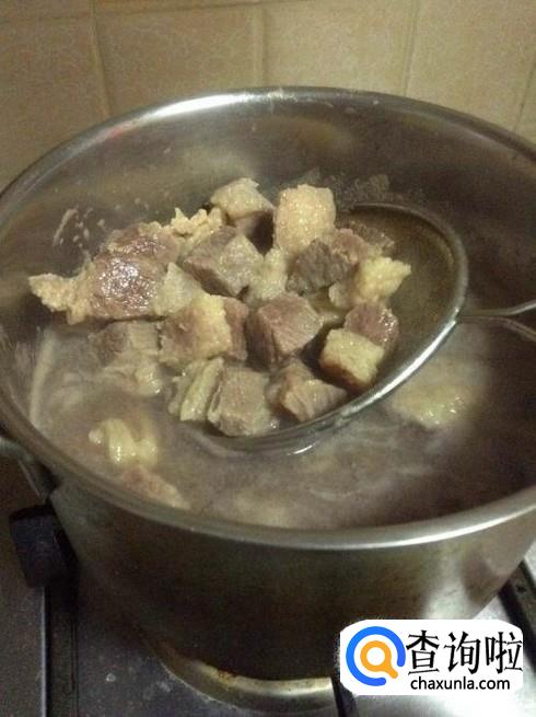 锅里烧开水,把牛肉块投进去煮,烧开之后把上面的沫撇去。加大火煮牛肉,一定要煮的软烂一些。