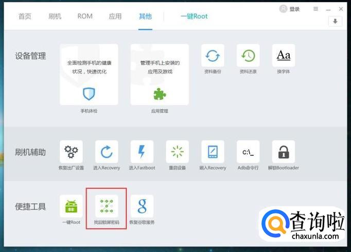 如果要接触手机上出厂设置的BootLoader锁的话,只需要点击软件页面中的BootLoader锁菜单,也可以实现类似的功能。