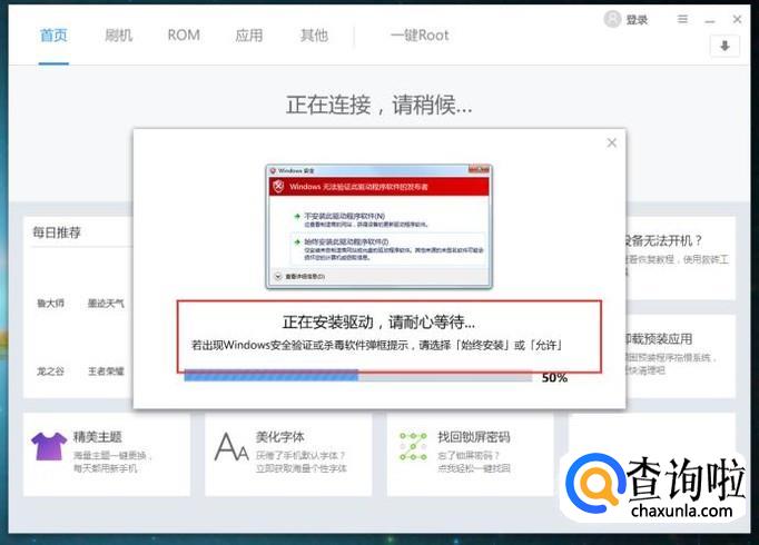 接下来,软件将自动安装手机中所需要的驱动程序,此过程大约持续约1分钟。