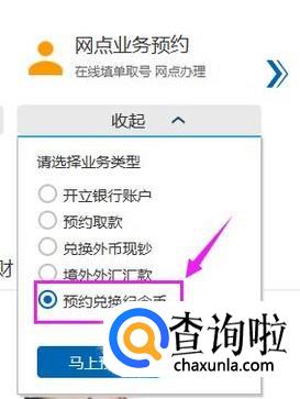 我们看到“网点业务”点击“马上预约”那三角形,如图。