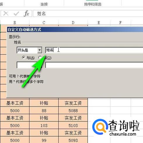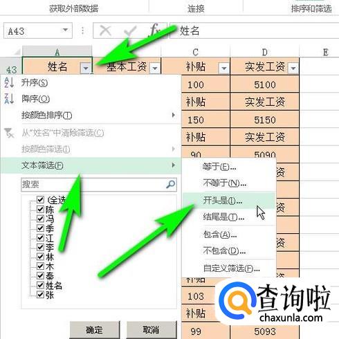 鼠标点姓名右侧的三角按钮,弹出面板,再点文本筛选;再点:开头是