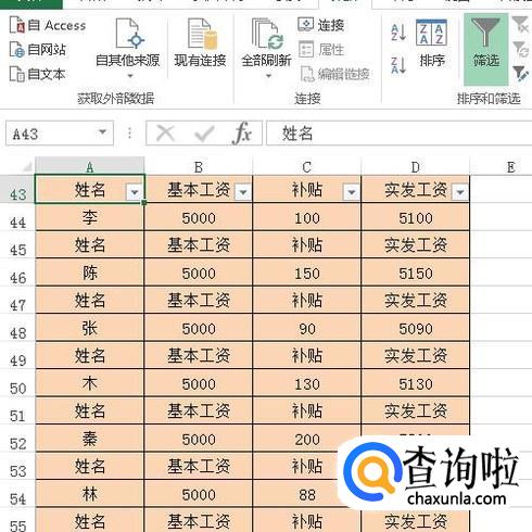 鼠标点一下A43单元格;再点数据菜单;下面展开相关的内容。再点:筛选