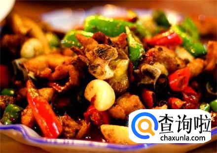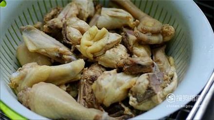 鸡肉剁成块,放进清水里浸泡二十分钟,捞出来放在热水中焯一下,鸡肉变色捞出来放在冷水中冲洗并控干水分。