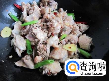 锅里油烧热之后放进去半勺子白糖将其溶化,然后把鸡块放进去翻炒,让鸡肉均匀的沾上糖液,随后把葱姜蒜和几片胡萝卜放进去一起翻炒。