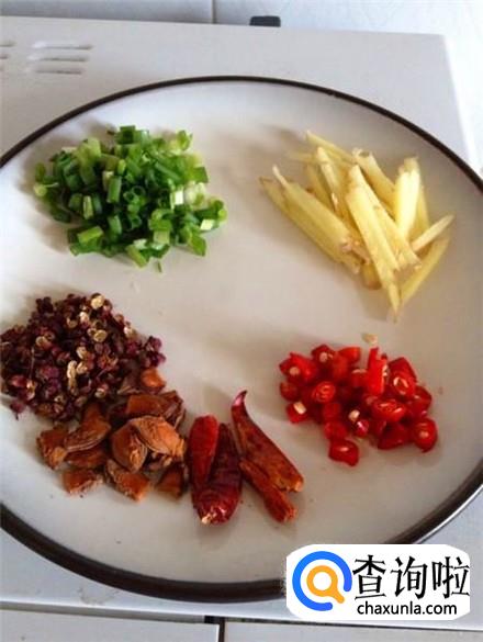 葱姜蒜分别切成片或者段,准备几个干红辣椒以及八角。