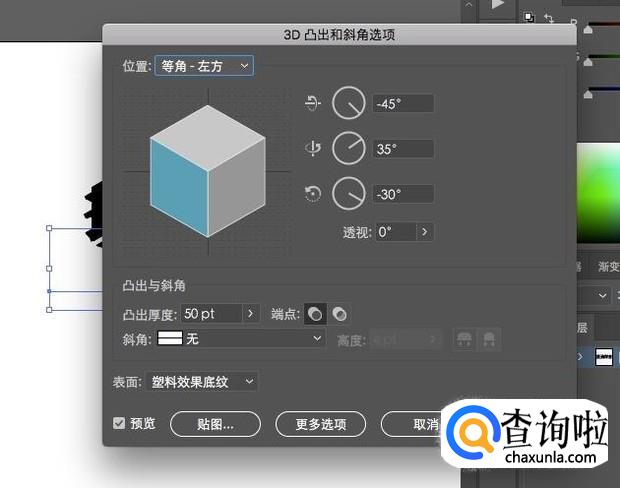在凸出和斜角面板中,调整方向和数值,查看预览。