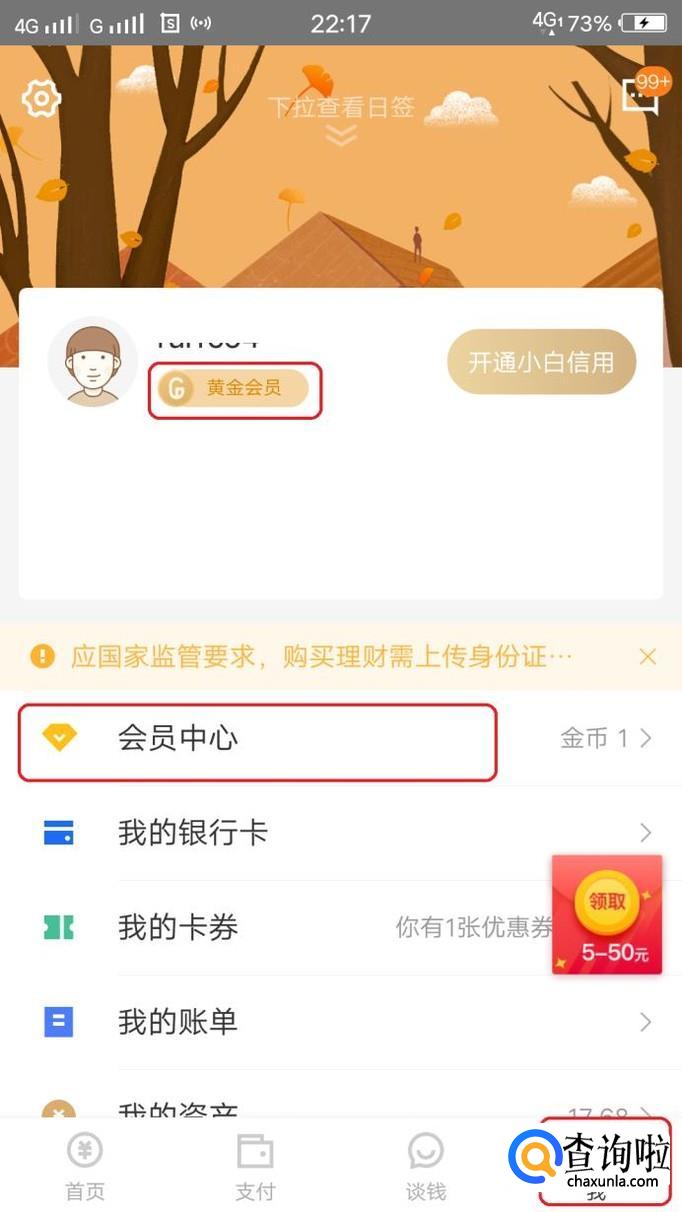 首先,下载安装并打开京东金融,点击右下角“我”,登录后就可以看到当前会员等级,我们点击“会员中心”,去看看铂金会员的标准。