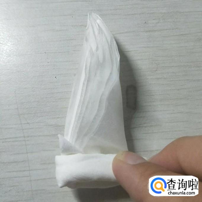我们沿着等腰三角形的底边,把手帕向上卷,卷到我们刚才向上翻折的三角形快要看不见为止(具体的还是要根据你选择的手帕的大小哈)