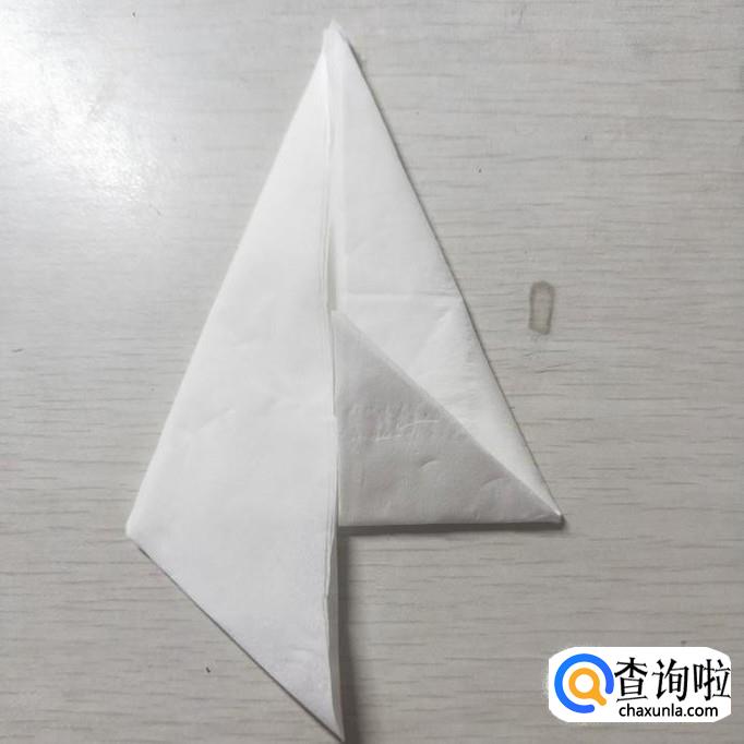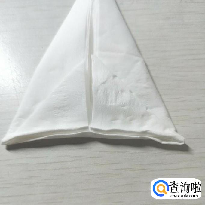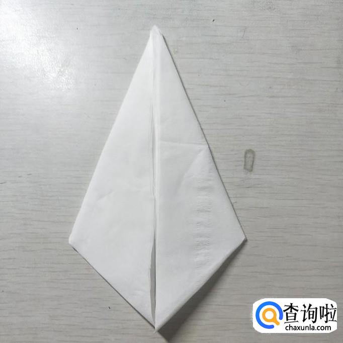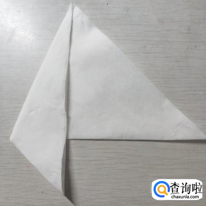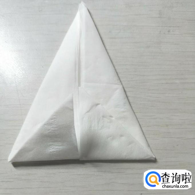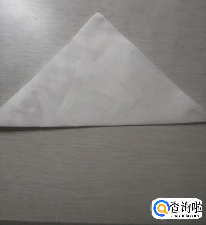 将对折后多出来的三角形向上翻折,此时我们的手帕已经成了一个等腰三角形
