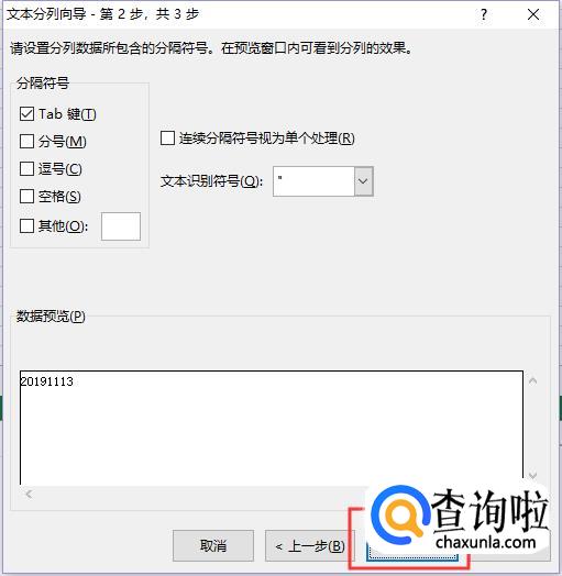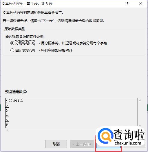 在弹出的对话框中,选择“原始数据类型”栏下的“分隔符号”,然后单击“下一步”。