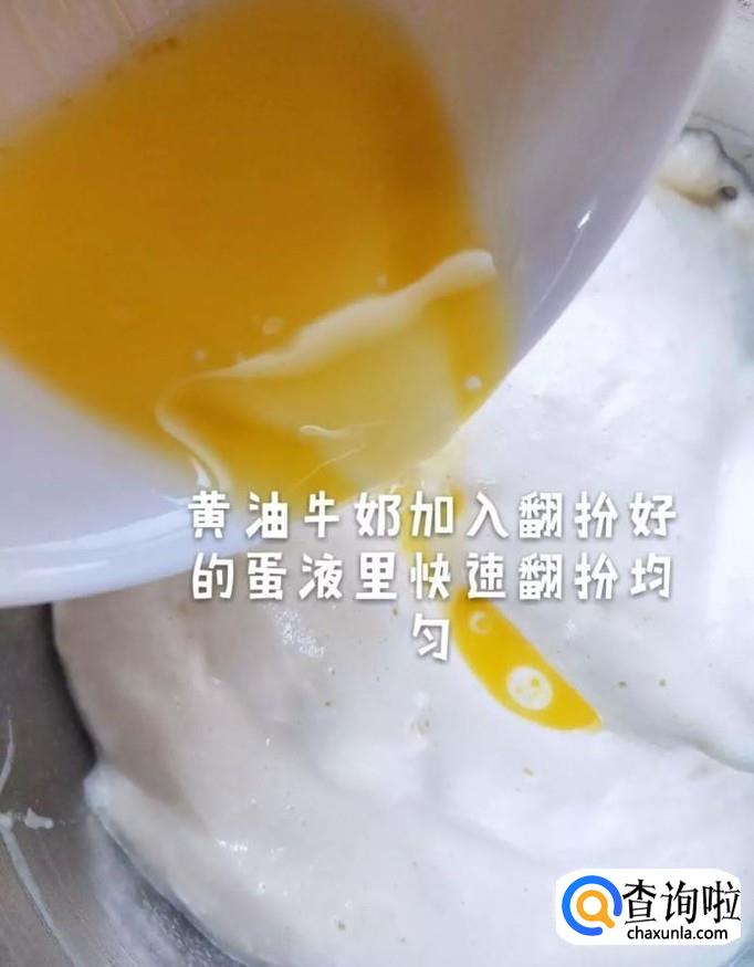 接着把黄油牛奶加入刚才搅拌好的材料中,搅拌均匀,如下图所示。