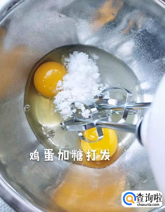 首先在一个碗中打入两颗鸡蛋并加入糖,用打蛋器高速打发,如下图所示。