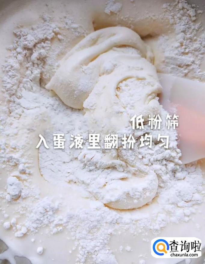 低粉过筛加入蛋液里搅拌均匀,如下图所示。
