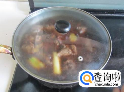 翻炒均匀后,放入适量的水,把锅盖盖上用文火进行炖制