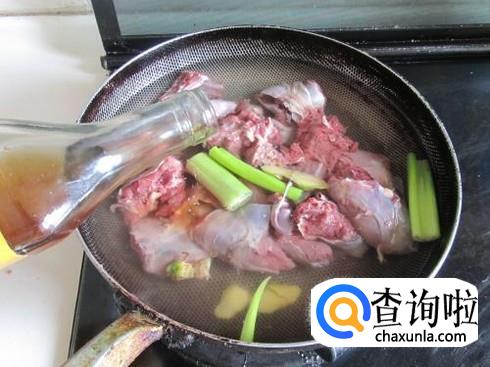 锅中放入葱姜,加入适量的水,把野兔肉放入锅中焯一遍水后捞出备用