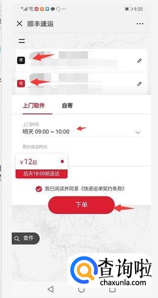 输入收件人的姓名、电话、地址,然后根据需要选择上门取件并且选择上门取件的时间,点击页面下方的下单就可以了