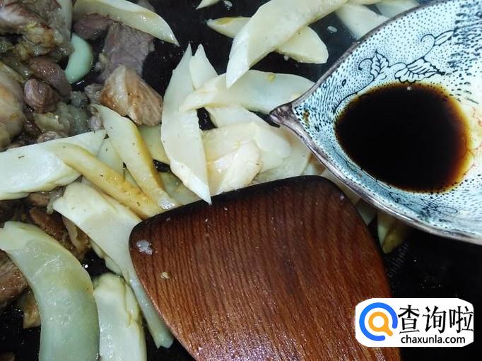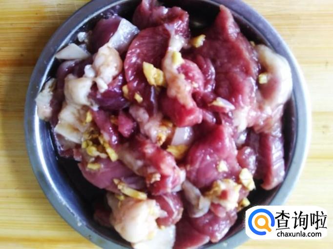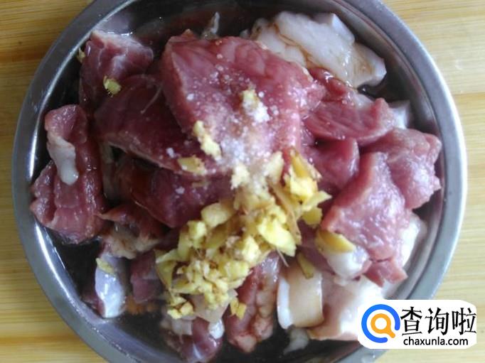 肉片里加适量的盐、姜蓉、1勺生抽、1勺料酒腌制几分钟。