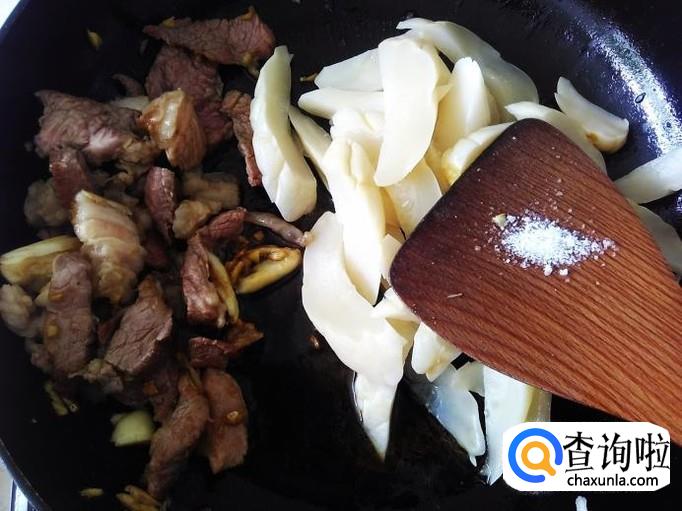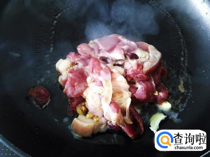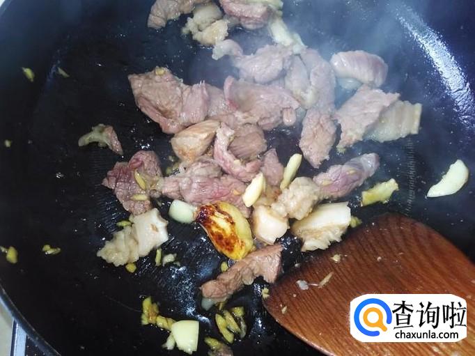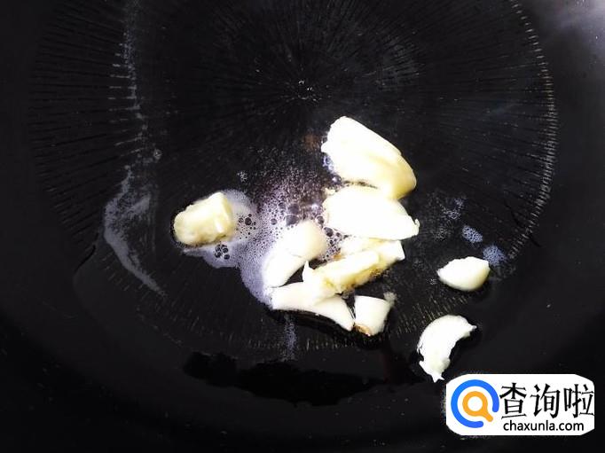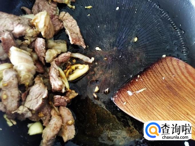 开火下油,放蒜米进去爆香,肉片下锅。