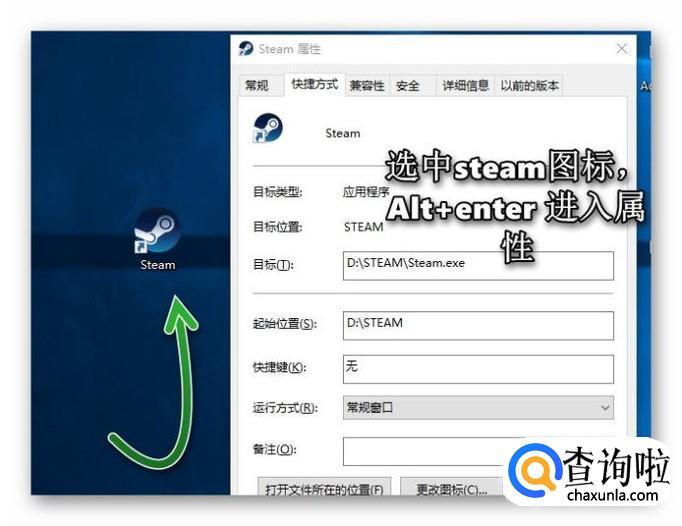 选中桌面上的steam图标,使用快捷键Alt+Enter进入到steam属性当中,如图。