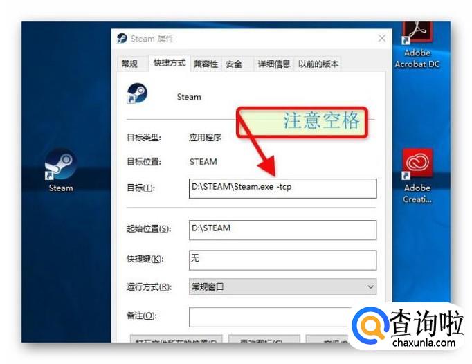 在快捷方式,目标后面添加命令行选项来启动steam,格式:空格+连字符+tcp