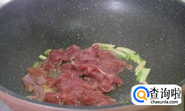 接下来把用酱油抹匀的肉放进锅里进行翻炒,如下图所示,一定不要让肉粘锅