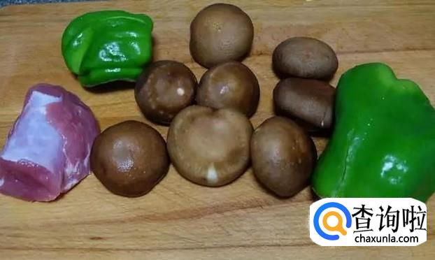 首先将准备好的香菇,青椒,猪肉都洗干净,洗好后将材料放在案板上,如下图所示