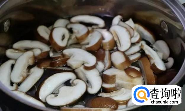 然后我们将香菇放在热水中煮一会,如下图所示,煮好后将香菇捞出来把水控干净