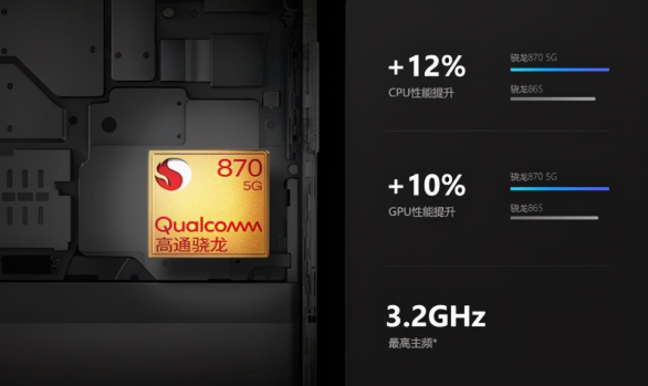 众所周知芯片越强命名就会越靠后,关于骁龙870这枚SoC,高通是这样定义的,骁龙870作为骁龙865 Plus移动平台的升级产品,采用了增强的高通Kryo 585 CPU,超级内核主频高达3.2GHz,性能强劲。值得注意的是,高通并没有点名骁龙870相较骁龙865 Plus的性能提升,仅点明了CPU的变化。