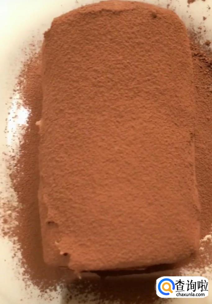 最后取出来,筛上一层可可粉,美味的蛋糕毛巾卷就制作完成啦!
