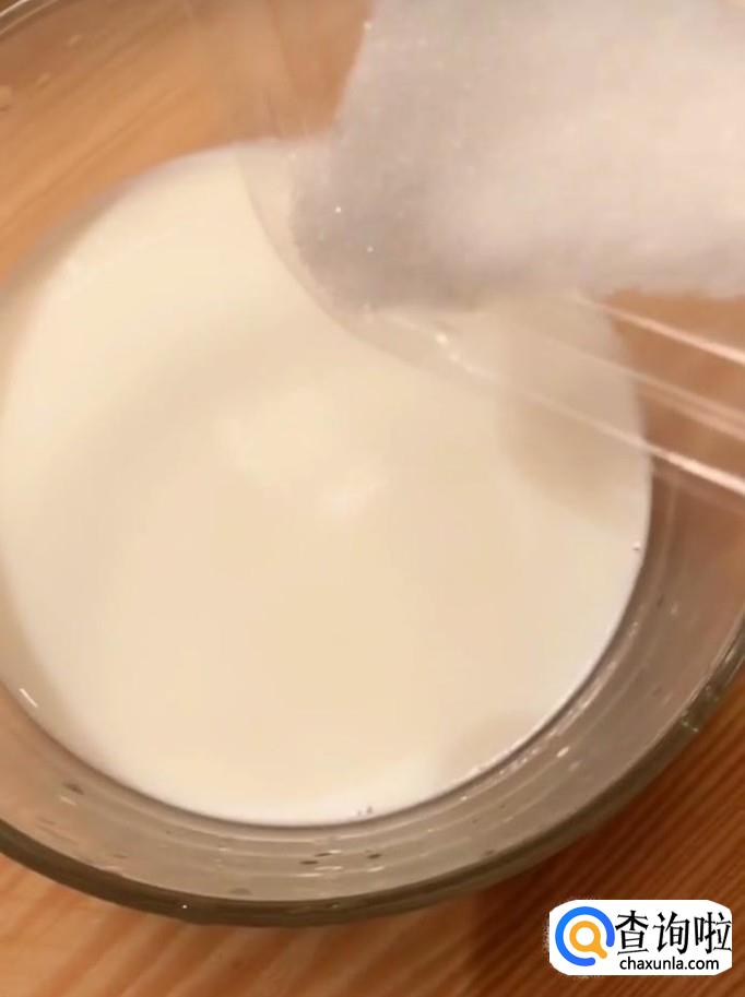 首先我们将150g牛奶倒入一个碗中,加入50g白糖,搅拌至完全融化
