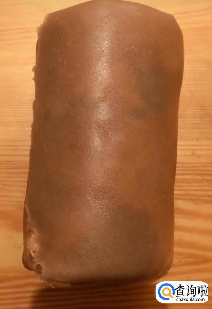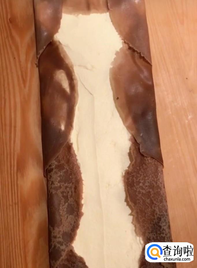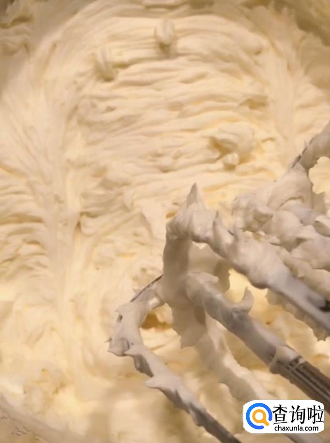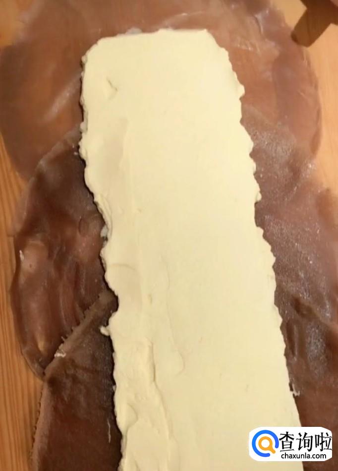 接着将淡奶油加适量的白糖打发至丝滑有纹路,摸在饼上面,如图所示,把它卷起来,放入冰箱冷藏一个小时