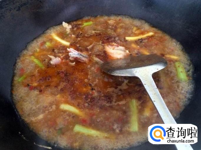 先将鱼骨放入汤里熬煮几分钟后,加入鱼肉煮熟,起锅前加适量盐和味精。
