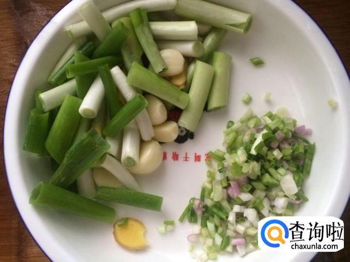大葱洗净切段,大蒜去皮洗净,姜去皮洗净切片,小葱洗净切碎。