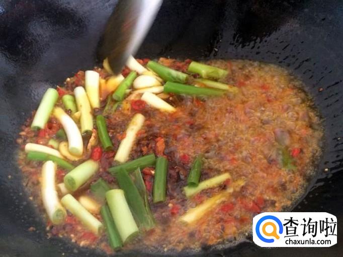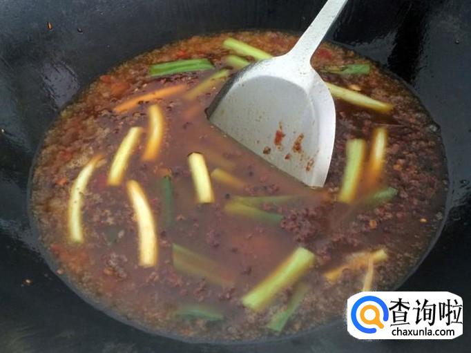 下姜、蒜、泡辣椒、豆瓣酱翻炒,爆香后加适量清水煮开。
