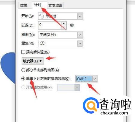 接着点击触发器,然后选择单击时播放动画效果,将后面的对象变成自己要点击的图案即可,然后播放幻灯片就可以进行播放了。