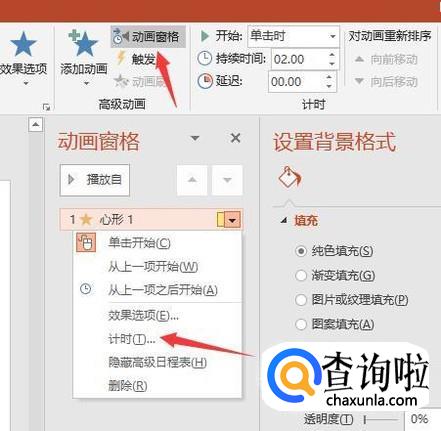 然后再点击动画窗格,接着点击动画效果,然后点击鼠标右键,这时候选择计时,在这里就可以设置点击图片进行播放了。