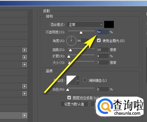 调出其设置面板。我们设置投影的不透明度为50