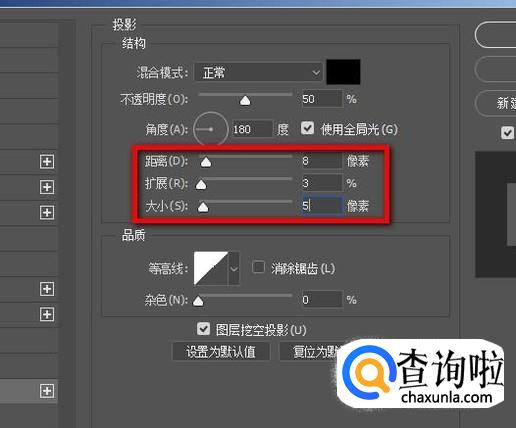 如图所示,设置“距离”参数为8;“扩展”设置参数为3;“大小”设置参数为5