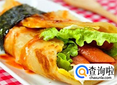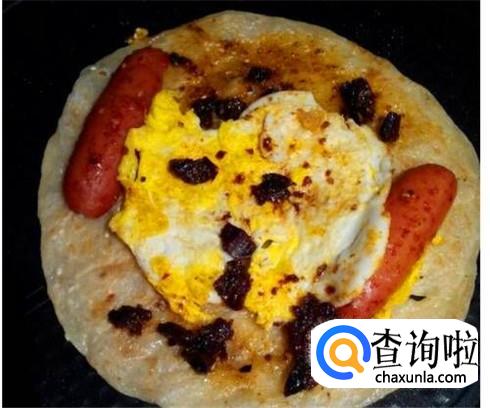 一根火腿肠切开两边放进饼里,加上一些辣酱均匀摊开。