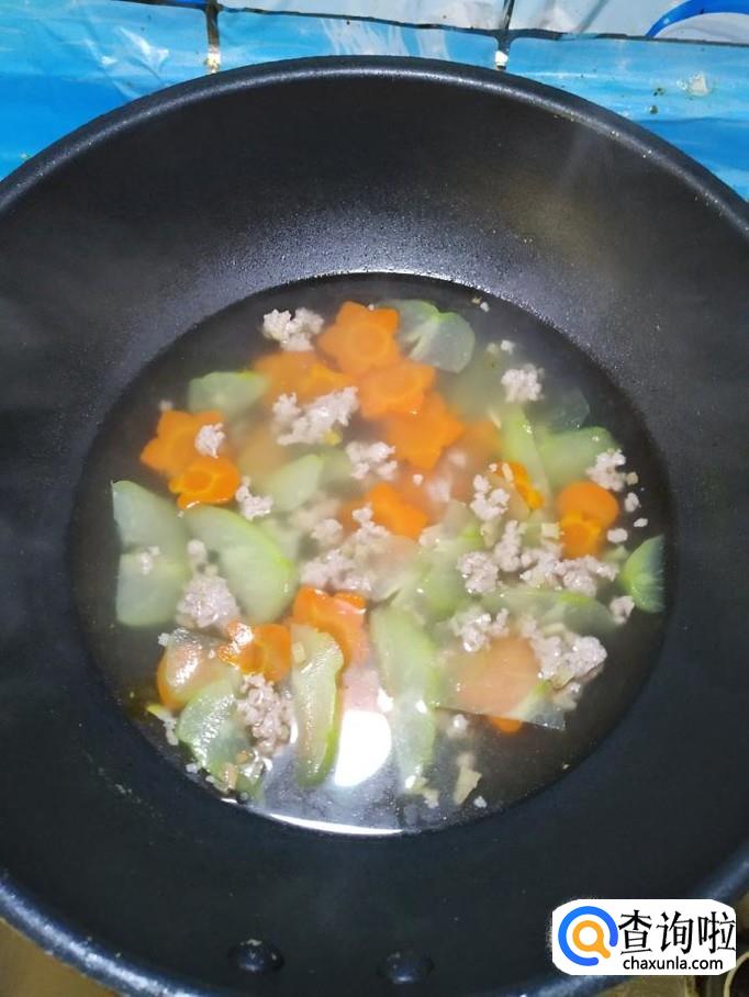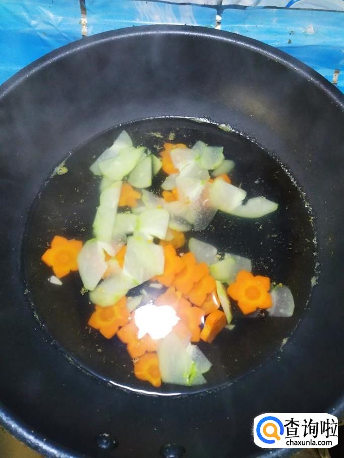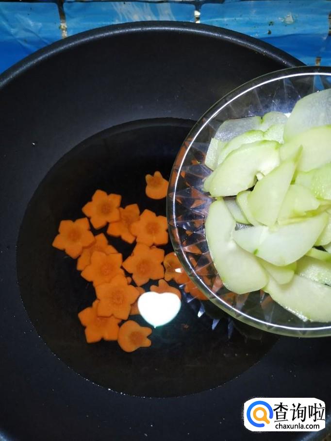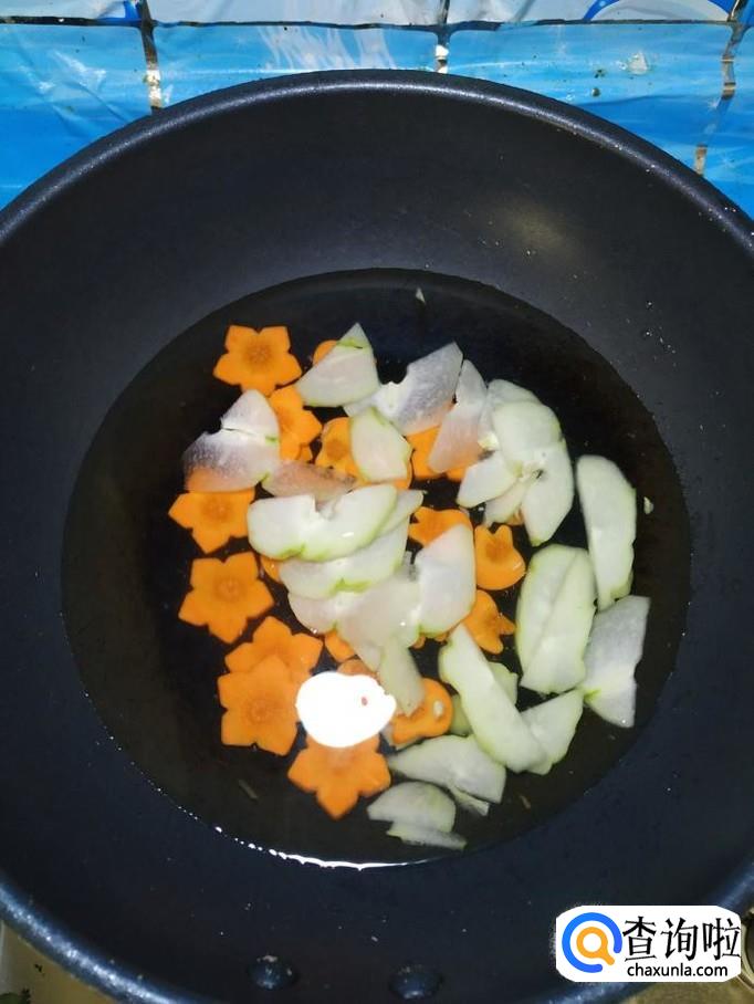 净准备好的佛手瓜片,放入锅中,和胡萝卜一起煮一下,水开后大约煮五分钟左右。