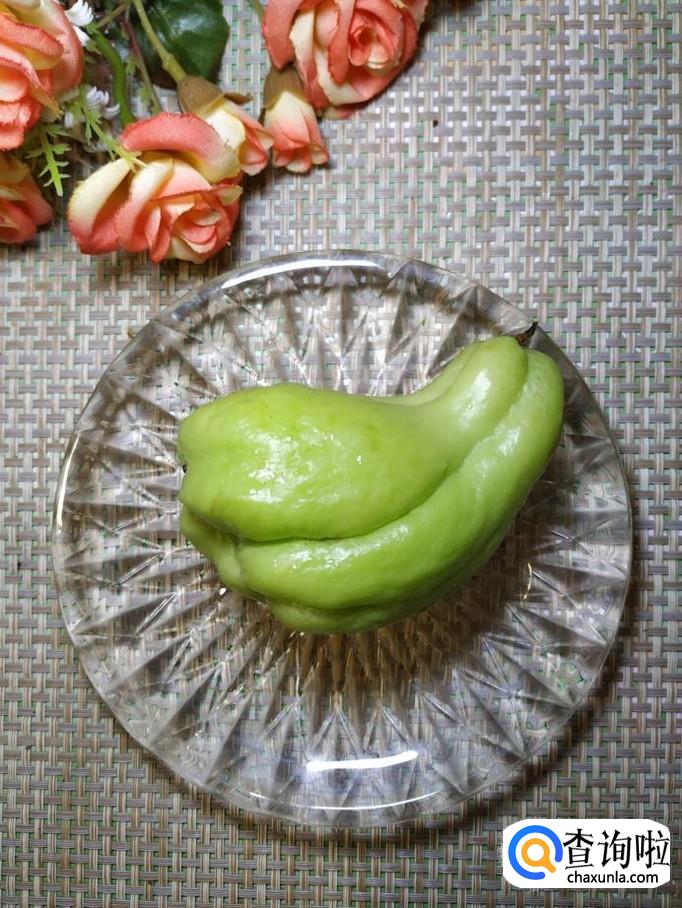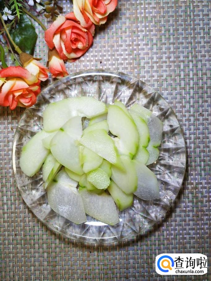 准备一个新鲜的佛手瓜,去皮去瓤,切成薄片,放入盘中备用。