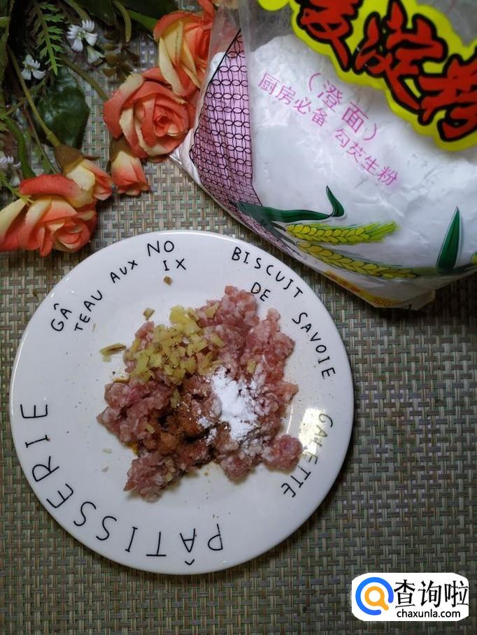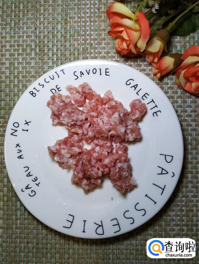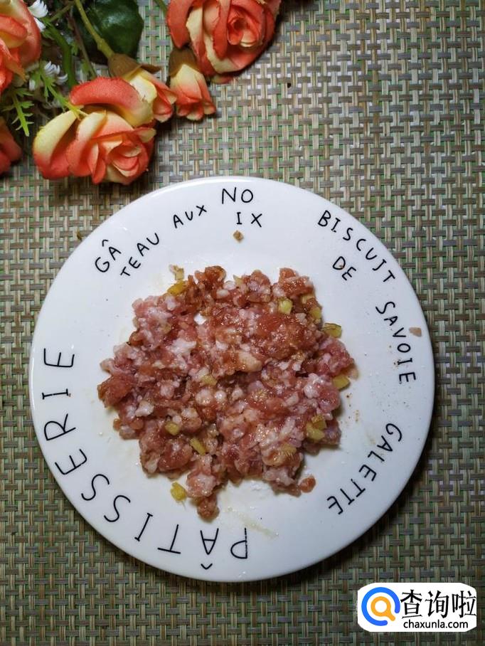 准备适量五花肉,洗净后剁成肉末,然后放入适量盐,鸡精,五香粉,生抽,淀粉,搅拌均匀后,腌制15分钟。